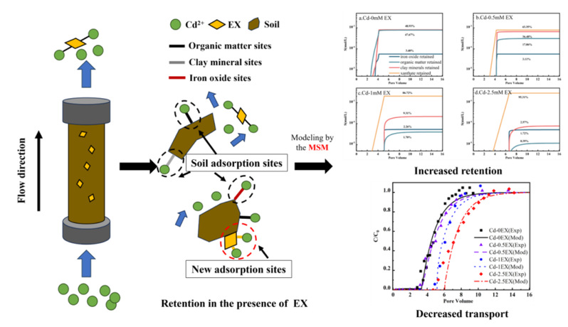 为解决上述问题,太阳官网罗博闻硕士研究生和陈扣平副教授通过两年的努力,建立了多表面形态络合反应模型(MSM),该模型刻画了典型重金属(Cd2+)与矿区浮选药剂(乙基黄原酸盐,EX)在实际土壤中的反应过程,并基于实验结果,成功应用该模型预测不同条件下EX对实际多孔介质中Cd2⁺运移过程的影响,揭示Cd2⁺在土壤各组分中的滞留机制。